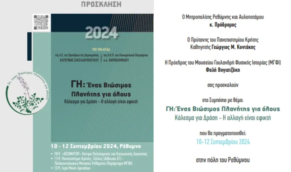 Το φλέγον ζήτημα της κλιματικής αλλαγής, η βιωσιμότητα και η αειφορία, θα τεθούν στο επίκεντρο του τριήμερου Οικολογικού Συμποσίου «ΓΗ: Ένας Βιώσιμος Πλανήτης για όλους – Κάλεσμα για Δράση – Η αλλαγή είναι εφικτή», που θα πραγματοποιηθεί στο Ρέθυμνο μεταξύ 10 και 12 Σεπτεμβρίου 2024.