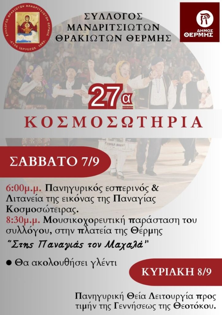 ΚεντρικήΚοινωνικάΤα 27α Κοσμοσωτήρια διοργανώνονται από τον Σύλλογο Μανδριτσιωτών Θρακιωτών Θέρμης by xristiana3 Σεπτεμβρίου 202418 Σεπτεμβρίου 20240312 Share00 3/9/2024 Ο Σύλλογος Μανδριτσιωτών Θρακιωτών Θέρμης διοργανώνει τα 27α Κοσμοσωτήρια που θα διαρκέσουν από 7-8 Σεπτεμβρίου. Αναλυτικά το πρόγραμμα των εκδηλώσεων περιλαμβάνει: