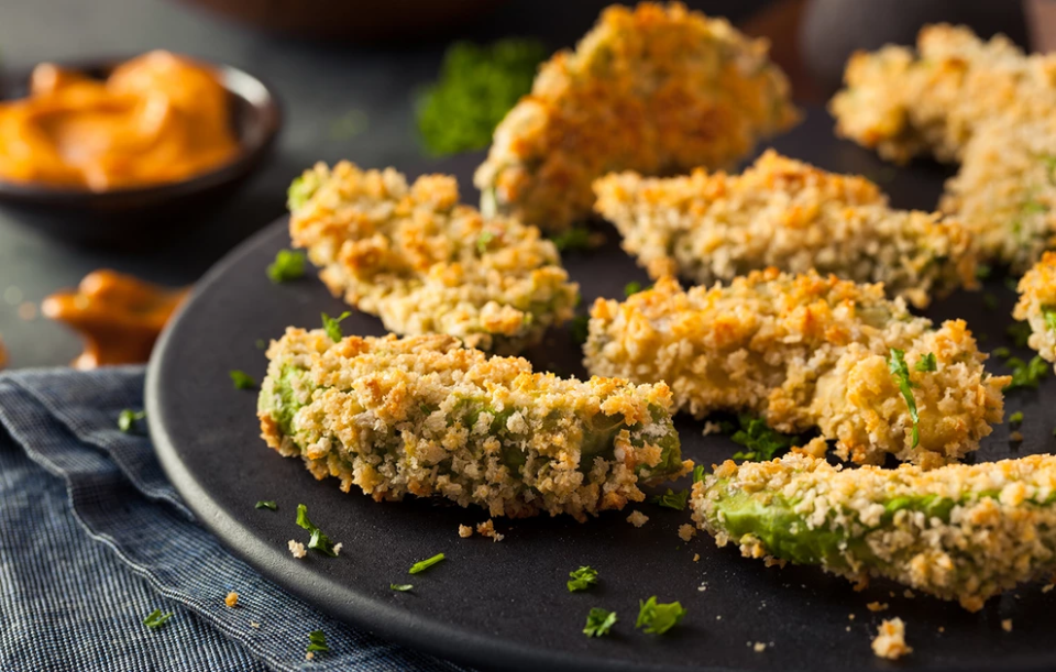 5. Βουτήξτε το αβοκάντο στο αλεύρι, στη συνέχεια στο αυγό και τέλος στην τριμμένη φρυγανιά.