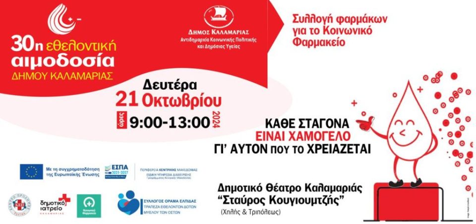 Με σύνθημα «Κάθε σταγόνα είναι χαμόγελο γι’ αυτόν που το χρειάζεται», ο Δήμος Καλαμαριάς διοργανώνει σε συνεργασία με το Νοσοκομείο «ΑΧΕΠΑ» την 30 η εθελοντική αιμοδοσία, τη Δευτέρα 21 Οκτωβρίου.