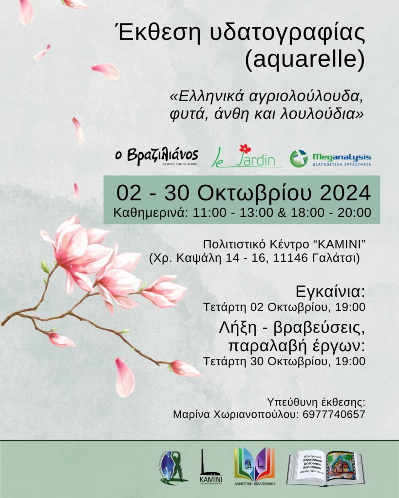 ΚεντρικήΚοινωνικάΈκθεση υδατογραφίας (aquarelle) με θέμα: «Ελληνικά αγριολούλουδα, φυτά, άνθη και λουλούδια», στο ΚΑΜΙΝΙ by xristiana1 Οκτωβρίου 20243 Οκτωβρίου 20240279 Share00 1/10/2024