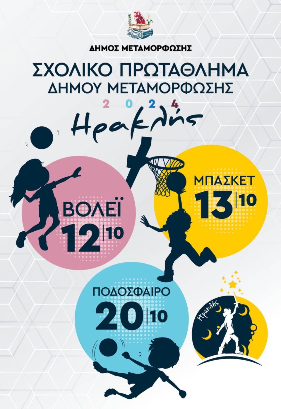 Το Σάββατο 12 Οκτωβρίου ξεκινά το Σχολικό Πρωτάθλημα «Ηρακλής» του Δήμου Μεταμόρφωσης. Ένα Πρωτάθλημα το οποίο πραγματοποιείται για δεύτερη συνεχή χρονιά και πλέον περιλαμβάνει τρία αθλήματα: μπάσκετ, βόλεϊ και ποδόσφαιρο.