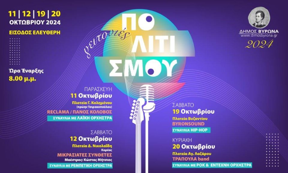 Ο Δήμος Βύρωνα αναβιώνει το θεσμό των γειτονιών Πολιτισμού παρουσιάζοντας ένα πλούσιο πρόγραμμα συναυλιών σε διάφορες πλατείες της πόλης μας.