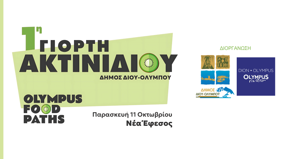 Ο Δήμος Δίου-Ολύμπου σας προσκαλεί στις 11-13 Οκτωβρίου 2024 σε ένα τριήμερο αφιερωμένο στον πρωτογενή τομέα και στο ακτινίδιο, τον «πράσινο χρυσό» της Πιερικής γης. Η εκδήλωση θα πραγματοποιηθεί στο πλαίσιο του Γαστρονομικού Φεστιβάλ Δήμου Δίου-Ολύμπου «Olympus Food Paths».