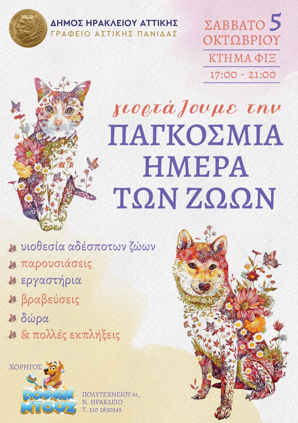 Ο Δήμος Ηρακλείου Αττικής γιορτάζει την Παγκόσμια Ημέρα των Ζώων και καλεί μικρούς και μεγάλους φιλόζωους της πόλης στο Κτήμα Φιξ το Σάββατο 5 Οκτωβρίου από τις 17.00 έως τις 21.00 για να γιορτάσουν μαζί. Το Γραφείο Αστικής Πανίδας του Δήμου έχει ετοιμάσει ένα γεμάτο απόγευμα με παρουσιάσεις, εργαστήρια, παιχνίδια και πολλές εκπλήξεις.