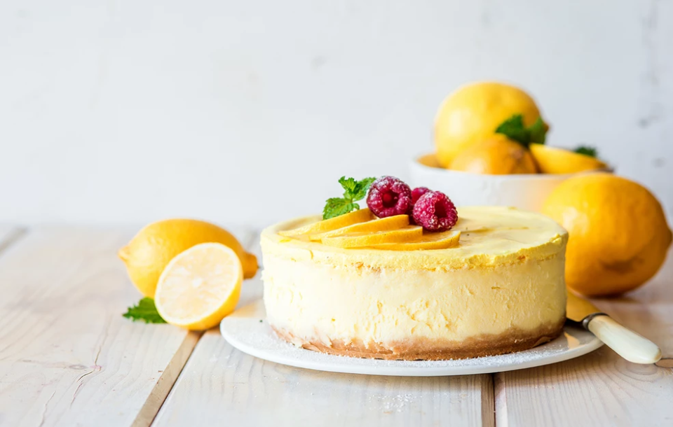 - Απλώστε το μείγμα τυριού κρέμας πάνω από τη βάση και γαρνίρετε με ξύσμα λεμονιού.