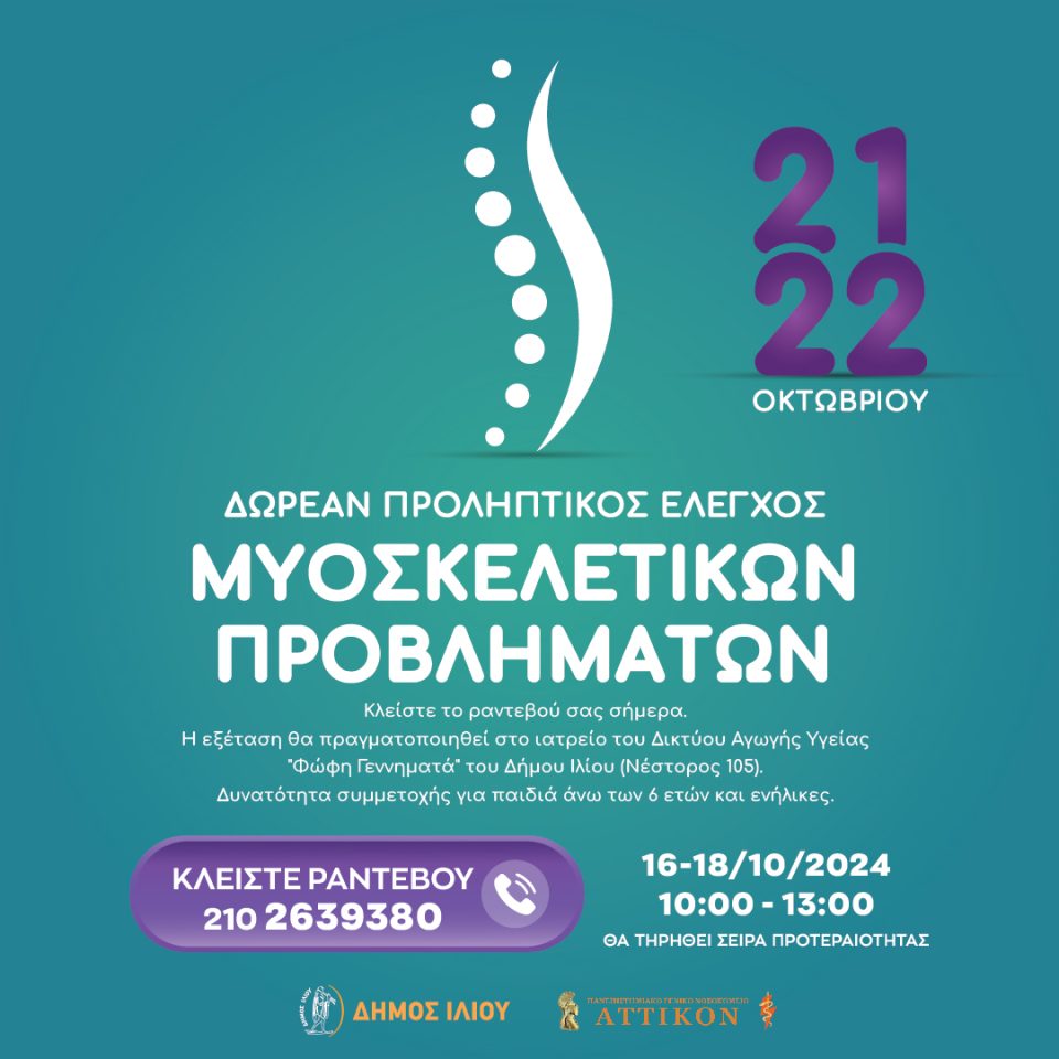 Ο Δήμος Ιλίου διοργανώνει ΔΩΡΕΑΝ προληπτικό μυοσκελετικό έλεγχο στις 21 και 22 Οκτωβρίου 2024. Τις εξετάσεις θα πραγματοποιήσουν ο κ. Ανδρέας Μαυρογένης, Ορθοπεδικός-Αθλίατρος του Πανεπιστημιακού Γενικού Νοσοκομείου «ΑΤΤΙΚΟΝ» και Καθηγητής της Α΄ Πανεπιστημιακής Κλινικής του ΕΚΠΑ, μαζί με την εξειδικευμένη ομάδα του.
