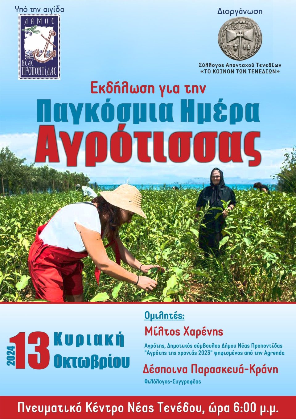 Ο Σύλλογος Απανταχού Τενεδίων “To Kοινόν των Τενεδίων” σας προσκαλεί στην εκδήλωση που θα πραγματοποιηθεί με αφορμή την ‘’Παγκόσμια Ημέρα Αγρότισσας’’, την Κυριακή 13 Οκτωβρίου 2024 στο Πνευματικό Κέντρο Νέας Τενέδου και ώρα 6 το απόγευμα.
