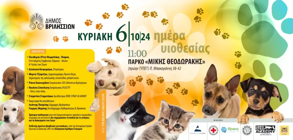 O Δήμος Βριλησσίων τιμά την Παγκόσμια Ημέρα Ζωών με μια γιορτη υιοθεσίας αδέσποτων που θα πραγματοποιηθεί την Κυριακή 06/10 στο πάρκο Μ. Θεοδωράκης (πρ. ΤΥΠΕΤ) από τις 11:00 το πρωί.