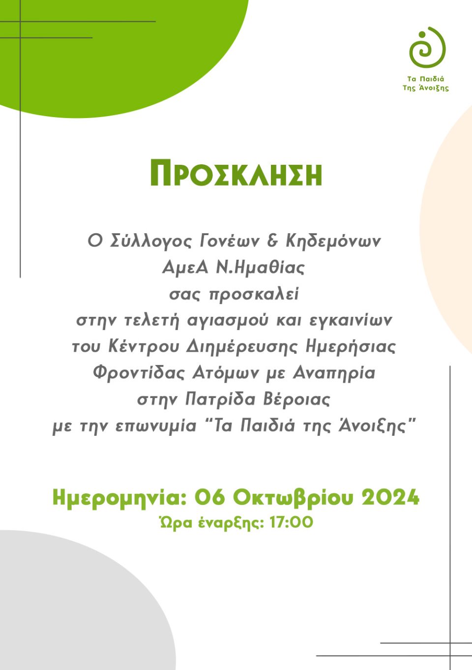 Η τελετή αγιασμού και εγκαινίων του Κέντρου Διημέρευσης Ημερήσιας Φροντίδας Ατόμων με Αναπηρία θα πραγματοποιηθεί αύριο (6 Οκτωβρίου), στις 17.00.