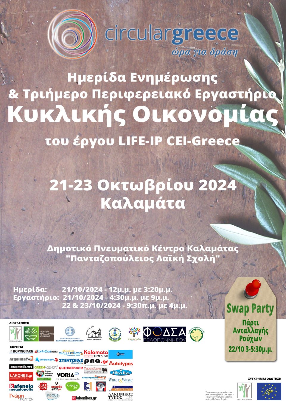 Το Πράσινο Ταμείο, το Υπουργείο Περιβάλλοντος και Ενέργειας (ΥΠΕΝ), η Περιφέρεια Πελοποννήσου, ο Δήμος Καλαμάτας, ο Φορέας Διαχείρισης Στερεών Αποβλήτων Πελοποννήσου (Φο.Δ.Σ.Α.) και η Οικολογική Εταιρεία Ανακύκλωσης (ΟΕΑ) συνδιοργανώνουν και σας προσκαλούν στην «Ημερίδα Ενημέρωσης και στο Περιφερειακό Εργαστήριο Κυκλικής Οικονομίας», από τις 21 έως και τις 23 Οκτωβρίου 2024, στην Καλαμάτα (Δημοτικό Πνευματικό Κέντρο Καλαμάτας – “Πανταζοπούλειος Λαϊκή Σχολή”, Αίθουσα: Αναγνωστήριο Λαϊκής Βιβλιοθήκης Καλαμάτας), στο πλαίσιο του Έργου LIFE-IP CEI-Greece – LIFE18 IPE/GR/000013 «Εφαρμογή της Κυκλικής Οικονομίας στην Ελλάδα».