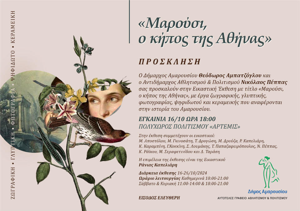 Τα εγκαίνια της εικαστικής έκθεσης με τίτλο: «Μαρούσι, ο κήπος της Αθήνας», θα πραγματοποιηθούν την Τετάρτη 16 Οκτωβρίου 2024, ώρα: 18:00, στον Πολυχώρο Πολιτισμού «ΑΡΤΕΜΙΣ» ( Βασ. Σοφίας 14 & Σουρή, Μαρούσι).