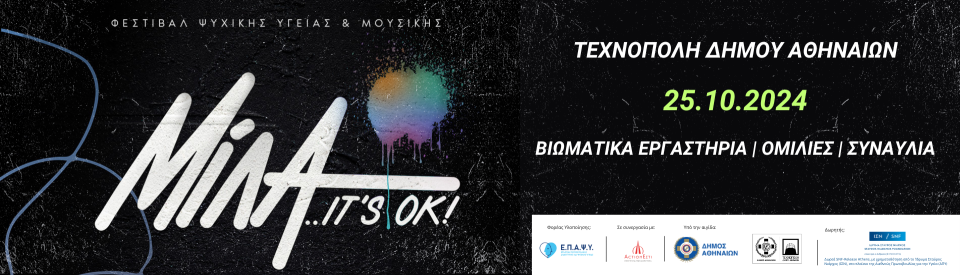 Το “ΜΙΛΑ… It’s OK!” είναι μία δράση της Εταιρείας Περιφερειακής Ανάπτυξης και Ψυχικής Υγείας (ΕΠΑΨΥ) και βασίζεται στην πεποίθηση ότι ο ανοιχτός διάλογος διαδραματίζει καθοριστικό ρόλο στην ευαισθητοποίηση σε θέματα ψυχικής υγείας και επιδιώκει να χρησιμοποιήσει την τέχνη για να οικοδομήσει μια κοινότητα, η οποία απορρίπτει το στίγμα και θέτει σε προτεραιότητα την ψυχική υγεία. Μπορείτε να διαβάσετε περισσότερα για την καμπάνια, καθώς και για τα Φεστιβάλ Λαμίας, Λάρισας & Σύρου, εδώ: https://www.epapsy.gr/wp-content/uploads/2024/08/Μίλα.-Its-OK-2.pdf