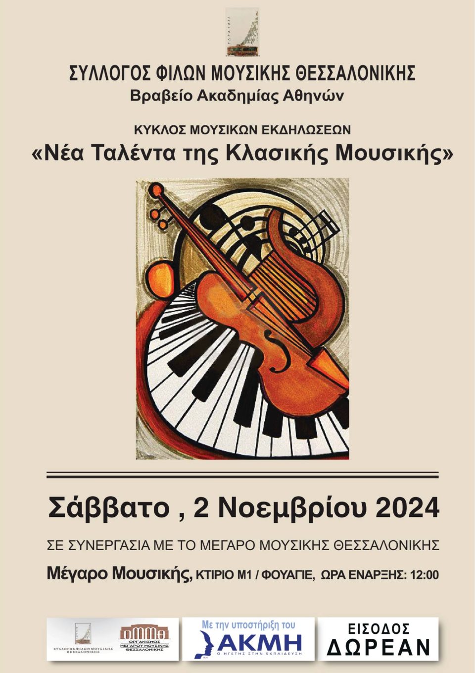 Ο Σύλλογος Φίλων Μουσικής Θεσσαλονίκης αναζήτησε και παρουσιάζει ενώπιον του κοινού της Θεσσαλονίκης , τα εντυπωσιακότερα Νέα Ταλέντα της Κλασσικής Μουσικής , το Σάββατο 2 Νοεμβρίου 2024 στις 12 το μεσημέρι στο Φουαγιέ Μ1 του Μεγάρου Μουσικής Θεσσαλονίκης .