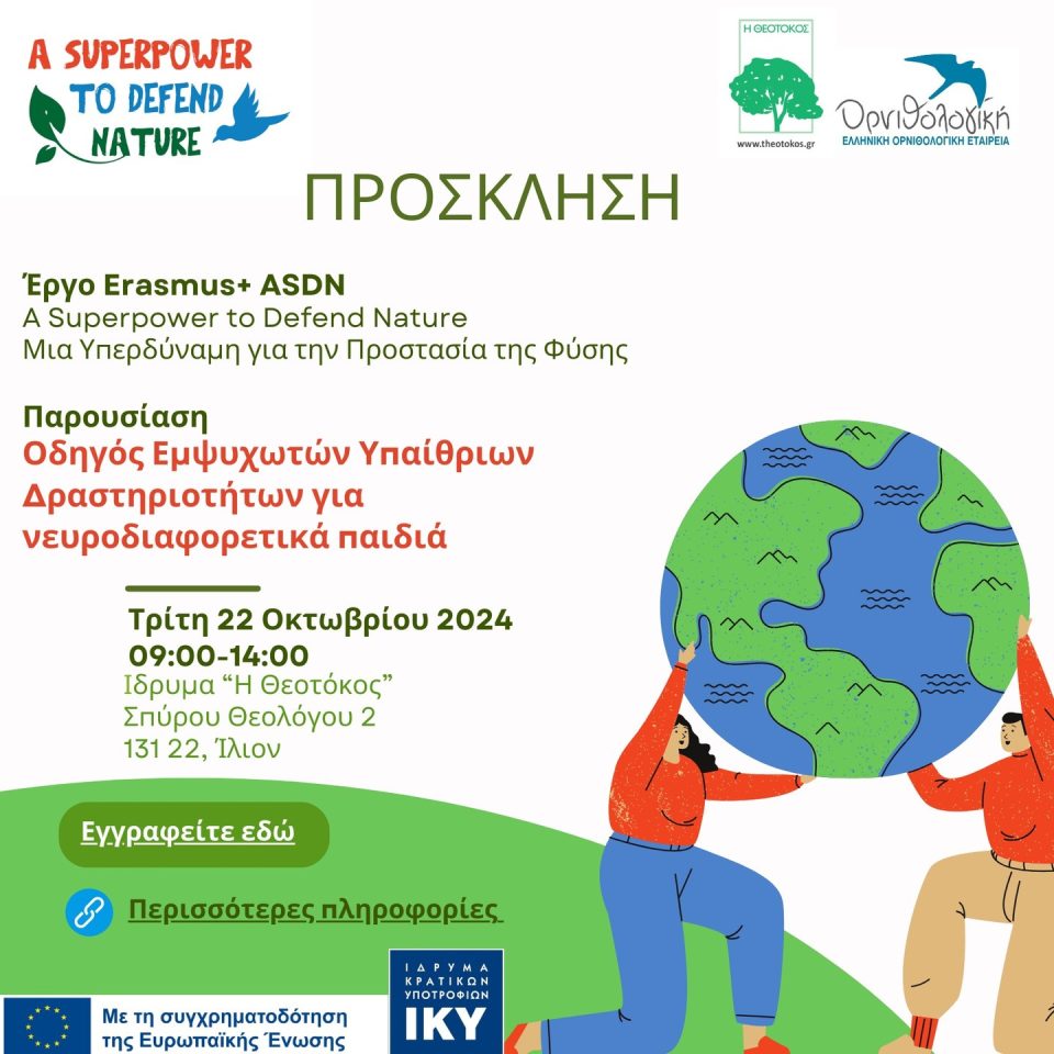 Σας προσκαλούμε στην ημερίδα του έργου Erasmus+ “A Superpower to Defend Nature”, που θα πραγματοποιηθεί την Τρίτη 22 Οκτωβρίου 2024 και ώρες 09:00-14:00 στο Ίδρυμα “Η Θεοτόκος”.
