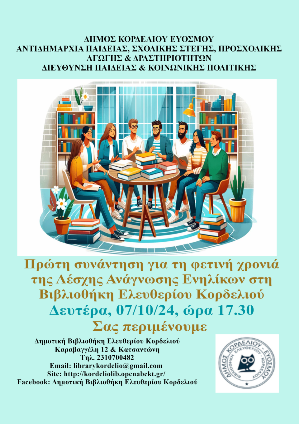 Τη Δευτέρα 7 Οκτωβρίου 2024, στις 17:30, θα πραγματοποιηθεί στη Δημοτική Βιβλιοθήκη Ελευθερίου – Κορδελιού η πρώτη για τη φετινή χρονιά συνάντηση της Λέσχης Ανάγνωσης για ενήλικες.Η Δημοτική Βιβλιοθήκη Ελευθερίου – Κορδελιού συνεχίζει τη Λέσχη Ανάγνωσης για ενήλικες, με σκοπό την ανάπτυξη και ενίσχυση της φιλαναγνωσίας και του διαλόγου.Όσοι και όσες αγαπούν τα βιβλία και το διάβασμα, επιθυμούν να συμμετάσχουν σε μια ζεστή παρέα – λέσχη, αλλά και να εμβαθύνουν στη σκέψη των συγγραφέων – δημιουργών, μπορούν να δηλώσουν συμμετοχή στο τηλ. 2310 700482.Η παρέα της βιβλιοθήκης σάς περιμένει με χαρά και διάθεση για νέες συζητήσεις και διαλόγους!