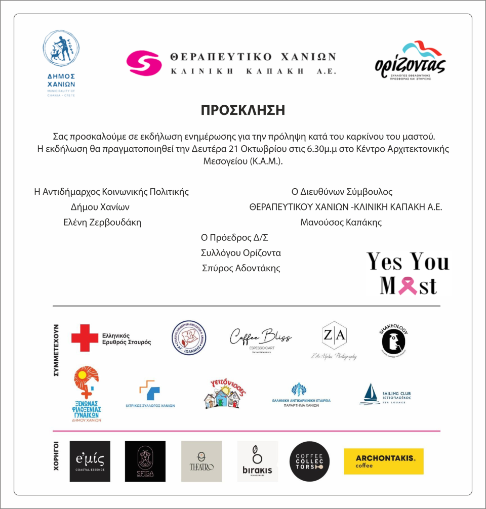 Την εκδήλωση οργανώνει ο Δήμος Χανίων, η κλινική Καπάκη και ο Σύλλογος Ορίζοντας.