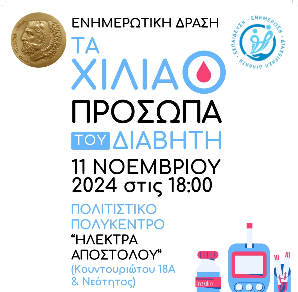 Η εκδήλωση θα πραγματοποιηθεί με αφορμή την Παγκόσμια Ημέρα Διαβήτη, τη Δευτέρα 11 Νοεμβρίου 2024 στις 18.00, στην κεντρική αίθουσα του Πολιτιστικού Πολύκεντρου “Ηλέκτρα Αποστόλου” (Κουντουριώτου 18Α & Νεότητος).