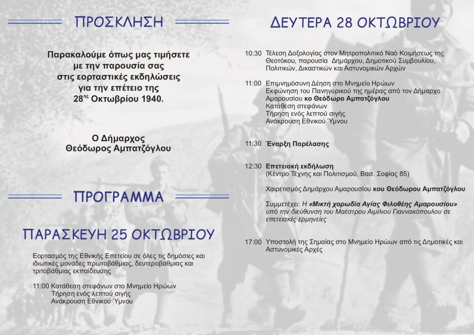 Ο Δήμος Αμαρουσίου γιορτάζει την Εθνική Επέτειο της 28ης Οκτωβρίου με κάθε επισημότητα και λαμπρότητα, όπως αρμόζει στους Ήρωες του Έπους του 1940 και απευθύνει πρόσκληση στους πολίτες να συνεορτάσουν και να τιμήσουν μαζί την Εθνική Επέτειο.