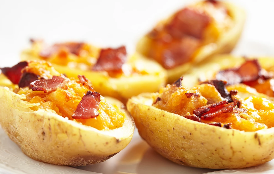 - Κόψτε τις πατάτες στη μέση. Αφαιρέστε με ένα κουτάλι το εσωτερικό τους, αφήνοντας λίγο για να μην διαλυθούν και τοποθετήστε τις πατάτες σε ένα ταψί με τη φλούδα προς τα πάνω.