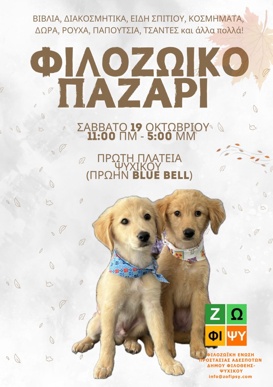 To Σάββατο 19 Οκτωβρίου θα πραγματοποιηθεί το υπαίθριο φθινοπωρινό παζάρι που διοργανώνουν οι εθελόντριες της ΖΩ.ΦΙ.ΨΥ, στην Α’ Πλατεία του Ψυχικού, (πρώην Blue Bell), από τις 11 το πρωί ως τις 5 το απόγευμα.