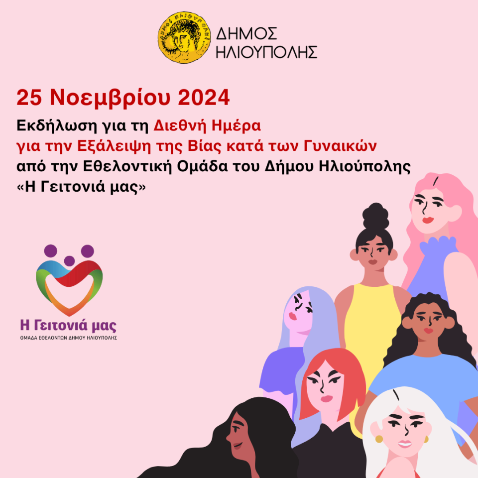 Ο Δήμος Ηλιούπολης σας καλεί σε μια εκδήλωση με μήνυμα αποφασιστικότητας και δράσης για την εξάλειψη της βίας κατά των γυναικών. Η εκδήλωση θα πραγματοποιηθεί τη Δευτέρα, 25 Νοεμβρίου 2024, στις 20:00, στο Θέατρο του Δημαρχιακού Μεγάρου Ηλιούπολης.