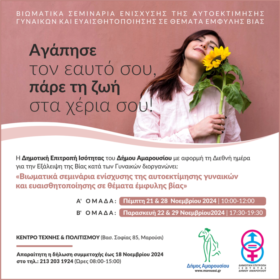 Με αφορμή τη Διεθνή Ημέρα για την Εξάλειψη της Βίας κατά των Γυναικών (25 Νοεμβρίου), η Δημοτική Επιτροπή Ισότητας του Δήμου Αμαρουσίου, με την υποστήριξη του Δημάρχου κου Θεόδωρου Αμπατζόγλου, διοργανώνει βιωματικά σεμινάρια ενίσχυσης της αυτοεκτίμησης γυναικών και ευαισθητοποίησης σε θέματα έμφυλης βίας, με τίτλο:« Αγάπησε τον εαυτό σου, πάρε τη ζωή στα χέρια σου!»