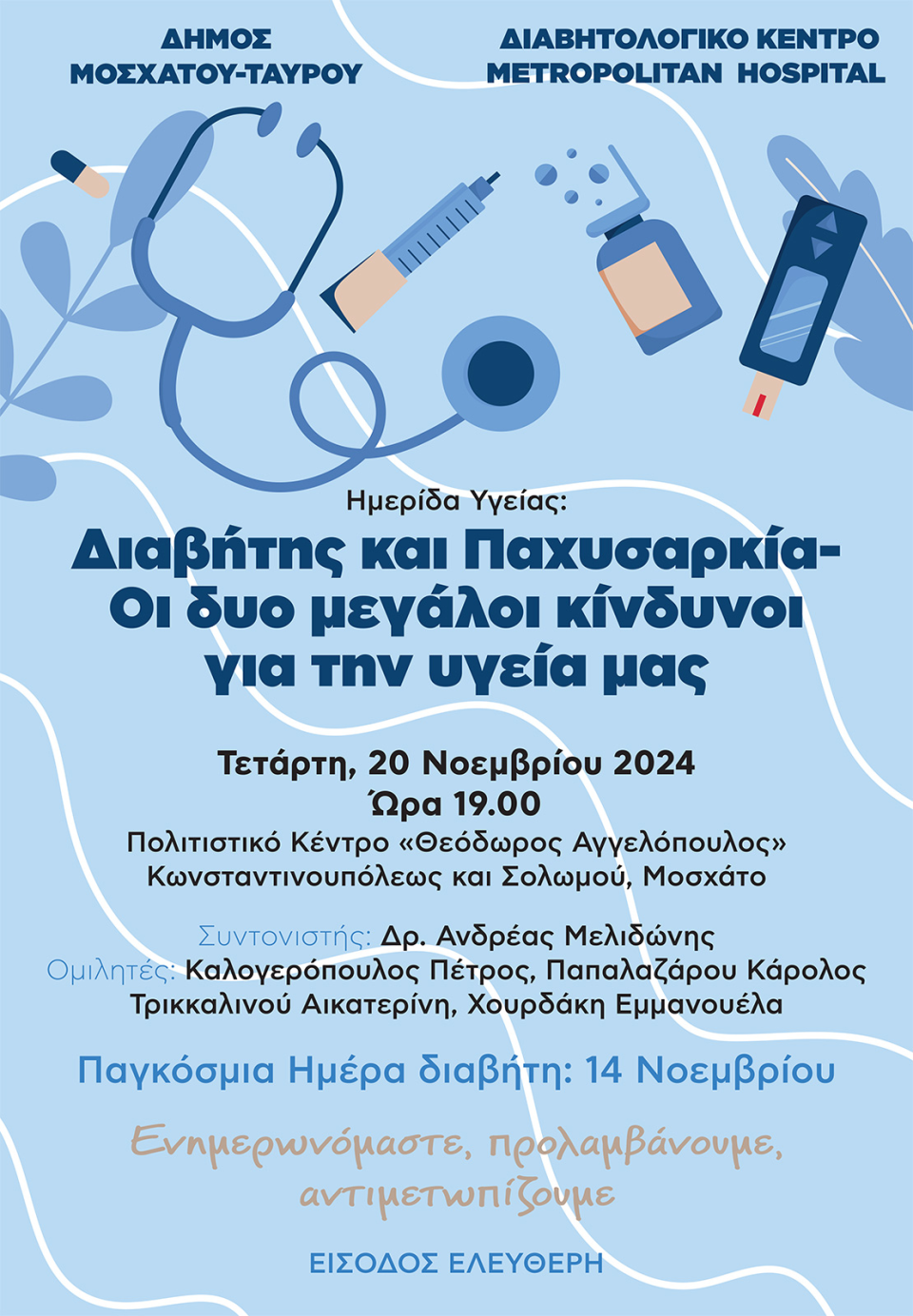Η ημερίδα υγείας που διοργανώνουμε με το Διαβητολογικό Κέντρο Metropolitan Hospital, με συντονιστή τον καταξιωμένο επιστήμονα, Δρ. Ανδρέα Μελιδώνη και ομιλητές γνωστούς επιστήμονες του ιατρικού τομέα έχει ως στόχο να μεταφέρει πολύτιμες γνώσεις και εμπειρίες για τη λήψη προληπτικών μέτρων ώστε να μειωθούν οι πιθανότητες εμφάνισης ή επιδείνωσης των παθήσεων.