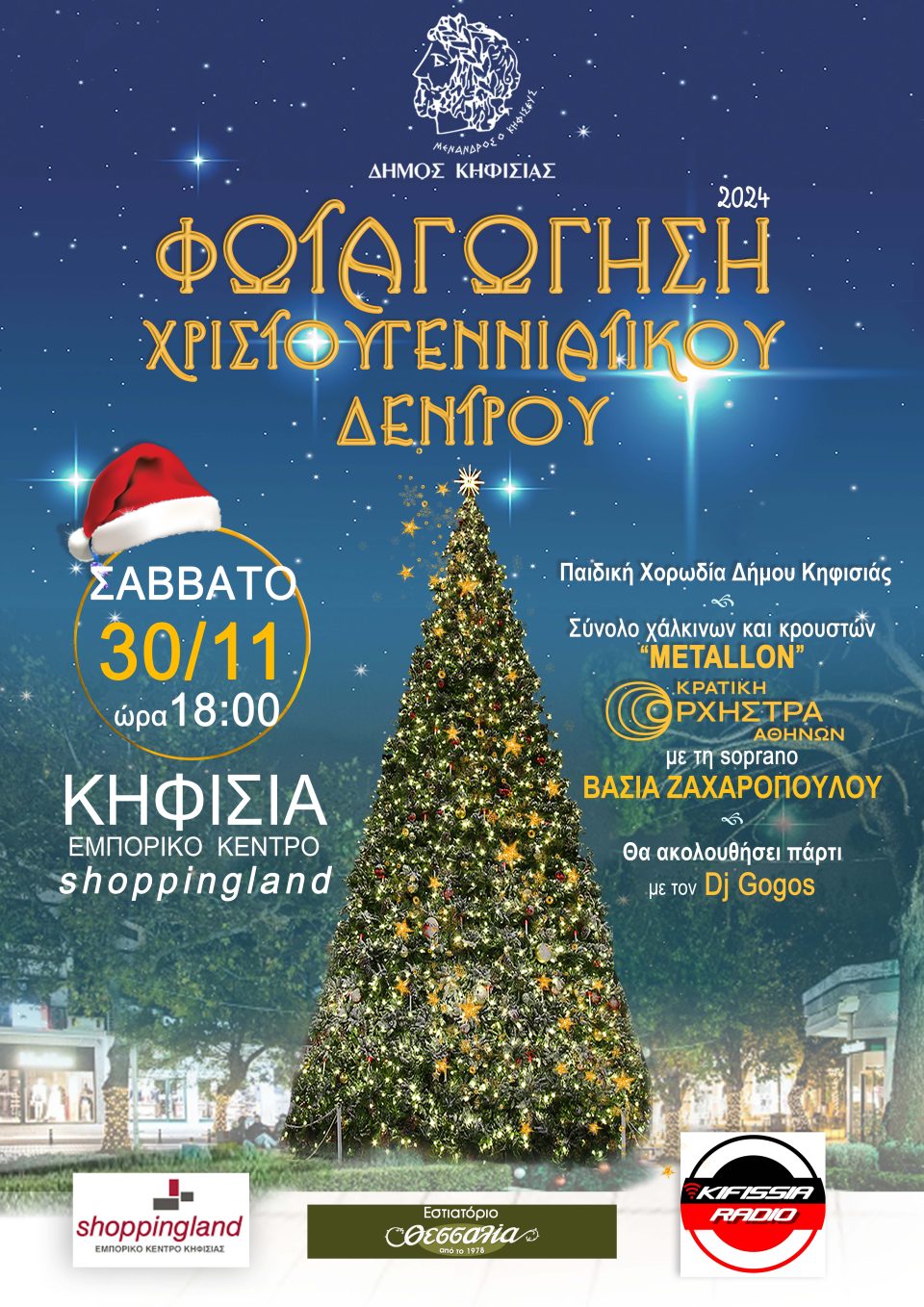 Το Σάββατο 30 Νοεμβρίου 2024 η Κηφισιά “ντύνεται” στα γιορτινά της! Στο Εμπορικό Κέντρο “Shoppingland” (Κολοκοτρώνη & Λεβίδου, Κηφισιά) ο Δήμαρχος Κηφισιάς κ. Βασίλης Ξυπολυτάς θα φωταγωγήσει στις 18.00 το Χριστουγεννιάτικο Δέντρο, σηματοδοτώντας την έναρξη της εορταστικής περιόδου στην πόλη.
