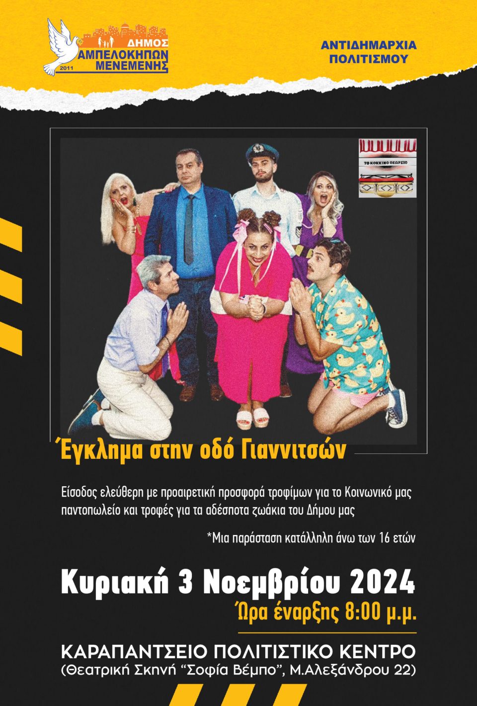 Σας προσκαλούμε την Κυριακή 3 Νοεμβρίου ώρα 8.00 μ.μ. στην θεατρική παράσταση «Έγκλημα στην Οδό Γιαννιτσών», στο Καραπάντσειο Πολιτιστικό Κέντρο (θεατρική σκηνή «ΣΟΦΙΑ ΒΕΜΠΟ», Μ. Αλεξάνδρου 22), σε μια απίστευτη κωμωδία από τη θεατρική ομάδα «Κόκκινο Θεωρείο» σε σκηνοθεσία του Χριστόδουλου Τζίμα.