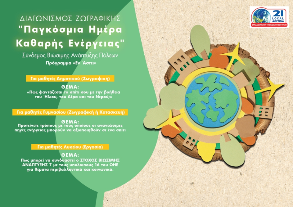 Διαγωνισμός για την Παγκόσμια Ημέρα «Καθαρής Ενέργειας για τους μαθητές των Δημοτικών, Γυμνασίων & Λυκείων σχολείων των Δήμων μελών του Συνδέσμου Βιώσιμης Ανάπτυξης Πόλεων με θέμα: «Ανανεώσιμες Πηγές Ενέργειας Προστατεύουμε τον πλανήτη και το μέλλον μας».