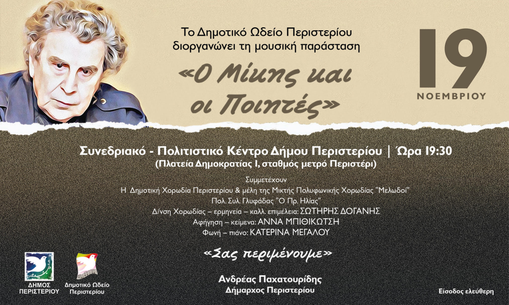 ΚεντρικήΚοινωνικάΟ Μίκης και οι Ποιητές: Μουσική Παράσταση στο Περιστέρι by xristiana17 Νοεμβρίου 20244 Δεκεμβρίου 20240187 Share00 17/11/2024 Την Τρίτη 19 Νοεμβρίου, ώρα 19.30 στο Πολιτιστικό – Συνεδριακό Κέντρο Δημαρχιακού Μεγάρου στο Περιστέρι, θα πραγματοποιηθεί η μουσική παράσταση: «Ο Μίκης και οι Ποιητές». Η είσδος είναι ελεύθερη. Πηγή: https://www.xtypos.gr
