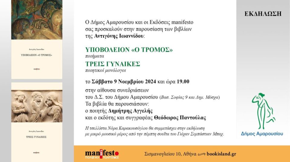 Την παρουσίαση των βιβλίων της Αντιγόνης Ιωαννίδου, διοργανώνουν οι εκδόσεις «manifesto» με την υποστήριξη του Δήμου Αμαρουσίου, το Σάββατο 9 Νοεμβρίου 2024 και ώρα 19:00, στο Δημαρχείο Αμαρουσίου (Βασ. Σοφίας 9 & Δ. Μόσχα).