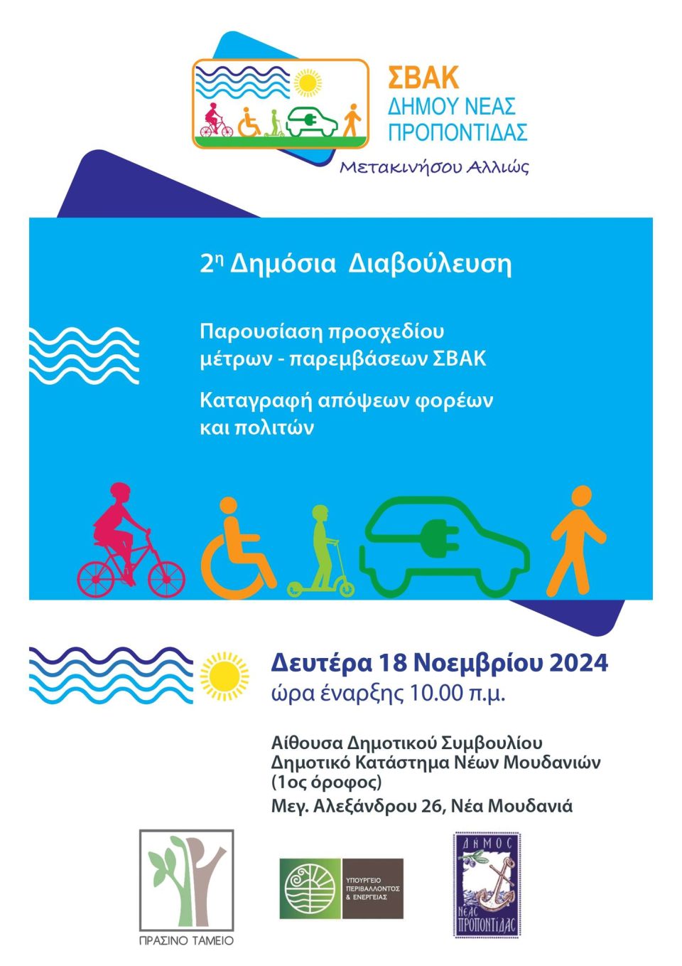 Ο Δήμος Νέας Προποντίδας διοργανώνει την 2η Δημόσια Διαβούλευση στο πλαίσιο εκπόνησης του Σχεδίου Βιώσιμης Αστικής Κινητικότητας – ΣΒΑΚ με σκοπό την Παρουσίαση του προσχεδίου μέτρων – παρεμβάσεων ΣΒΑΚ.