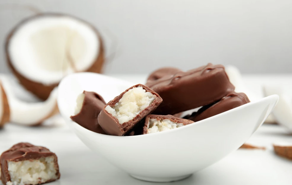 - Ξεφορμάρετε τις μπουκιές καρύδας και περάστε από τη λιωμένη κουβερτούρα, μέχρι να καλυφθούν απ’ όλες τις πλευρές.