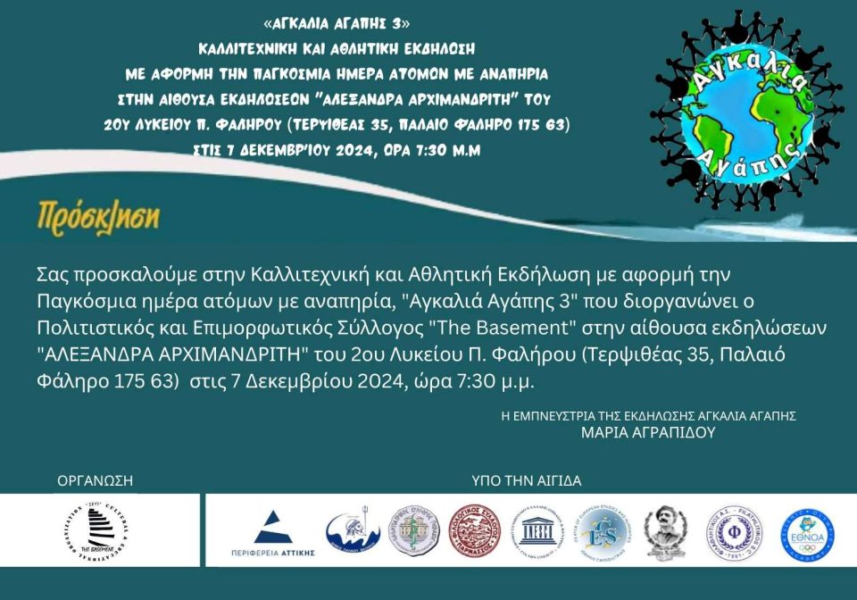 Με αφορμή την Παγκόσμια Ημέρα Ατόμων με Αναπηρία, ο Δήμος Παλαιού Φαλήρου και ο Πολιτιστικός και Επιμορφωτικός Σύλλογος ‘The Basement’ σας προσκαλούν στην εκδήλωση – θεσμός που ενώνει θέματα αναπηρίας και καλλιτεχνικές δράσεις επιστρέφει για 3η χρόνια!