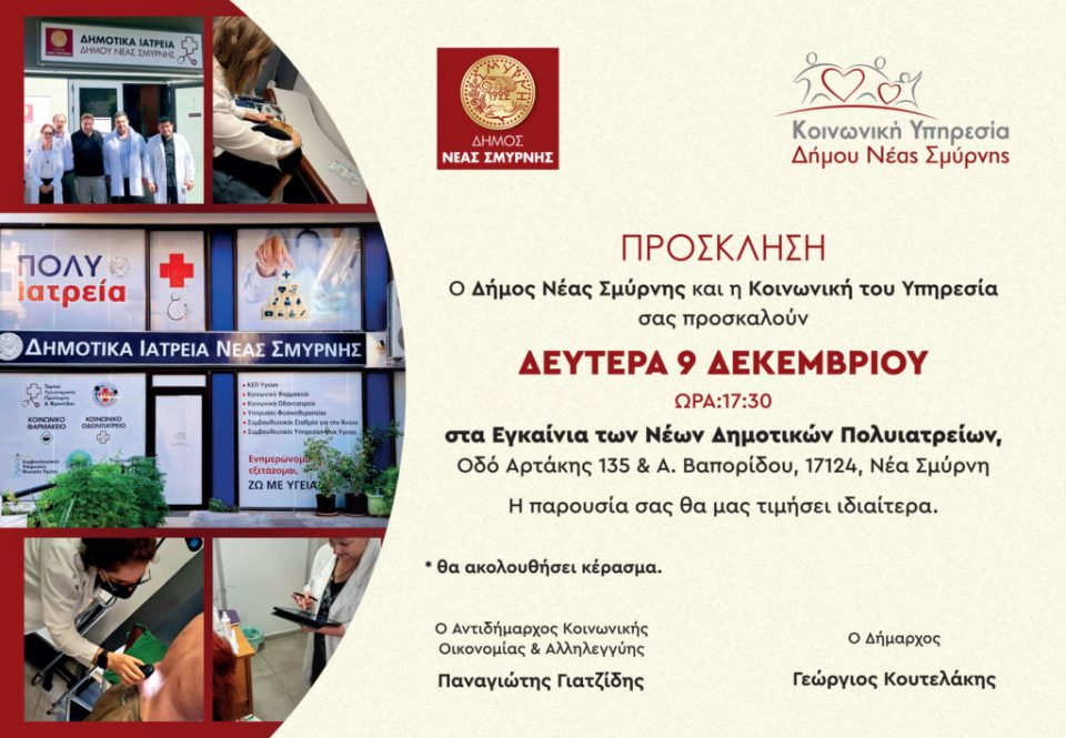 Σε νέες σύγχρονες κτιριακές εγκαταστάσεις στεγάζονται πλέον τα Δημοτικά Πολυιατρεία Νέας Σμύρνης στην Οδό Αρτάκης 135 & Α. Βαπορίδου. Τα εγκαίνια των νέων χώρων θα πραγματοποιηθούν την Δευτέρα 9 Δεκεμβρίου, ώρα 17:30 από τον Δήμαρχο Γιώργο Κουτελάκη και τον Αντιδήμαρχο Κοινωνικής Οικονομίας & Αλληλεγγύης Παναγιώτη Γιατζίδη.