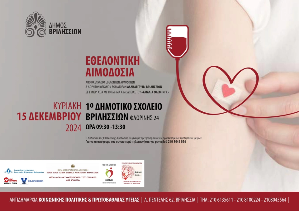 Η εθελοντική αιμοδοσία υπό την αιγίδα του Δήμου Βριλησσίων και του Εθνικού Κέντρου Αιμοδοσίας θα πραγματοποιηθεί από 9:30-13:30.