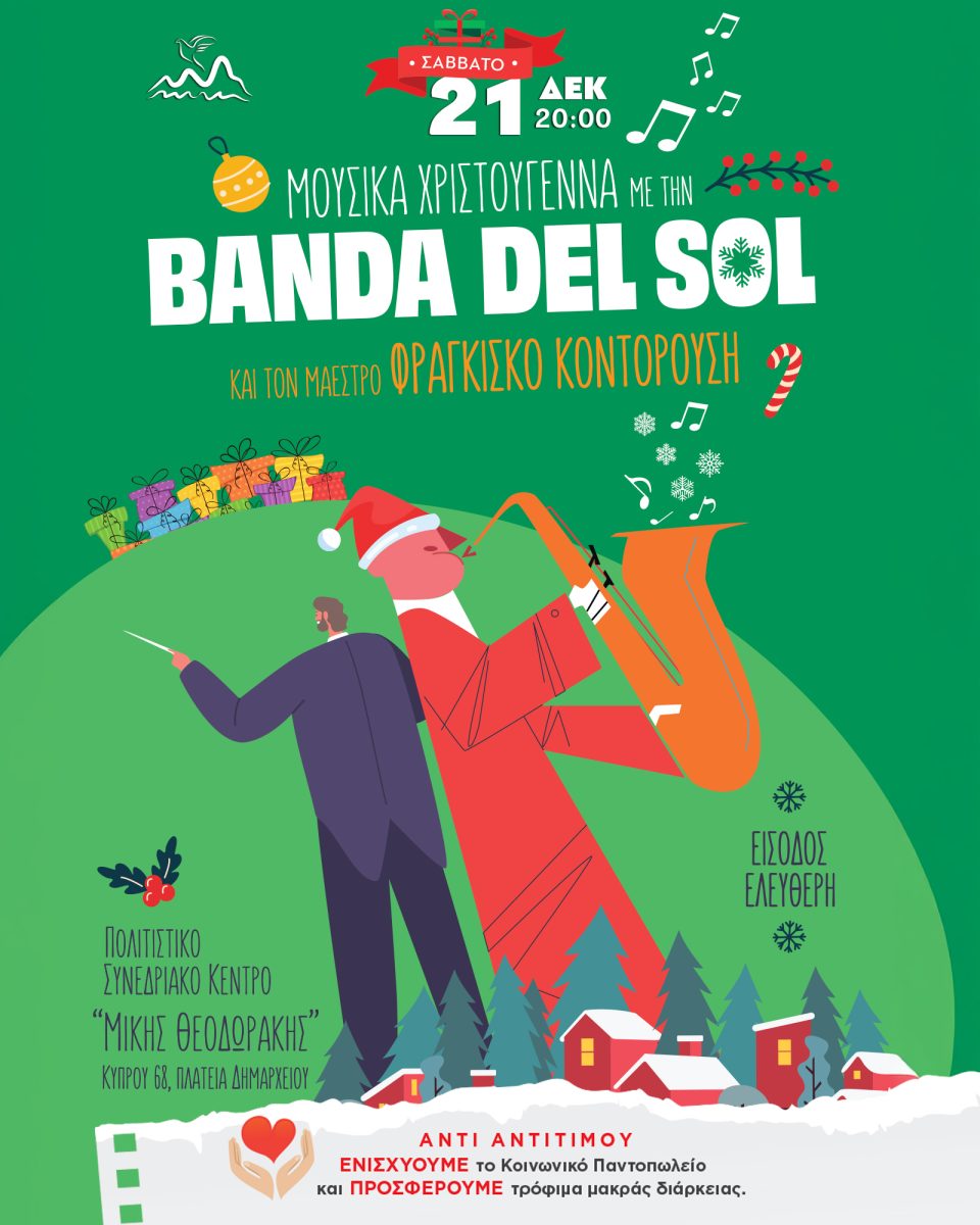 Το Σάββατο 21 Δεκεμβρίου στις 20:00, ελάτε να γιορτάσουμε παρέα τα Χριστούγεννα με τη μουσική μπάντα Banda Del Sol υπό τη διεύθυνση του μαέστρου Φραγκίσκου Κοντορούση.