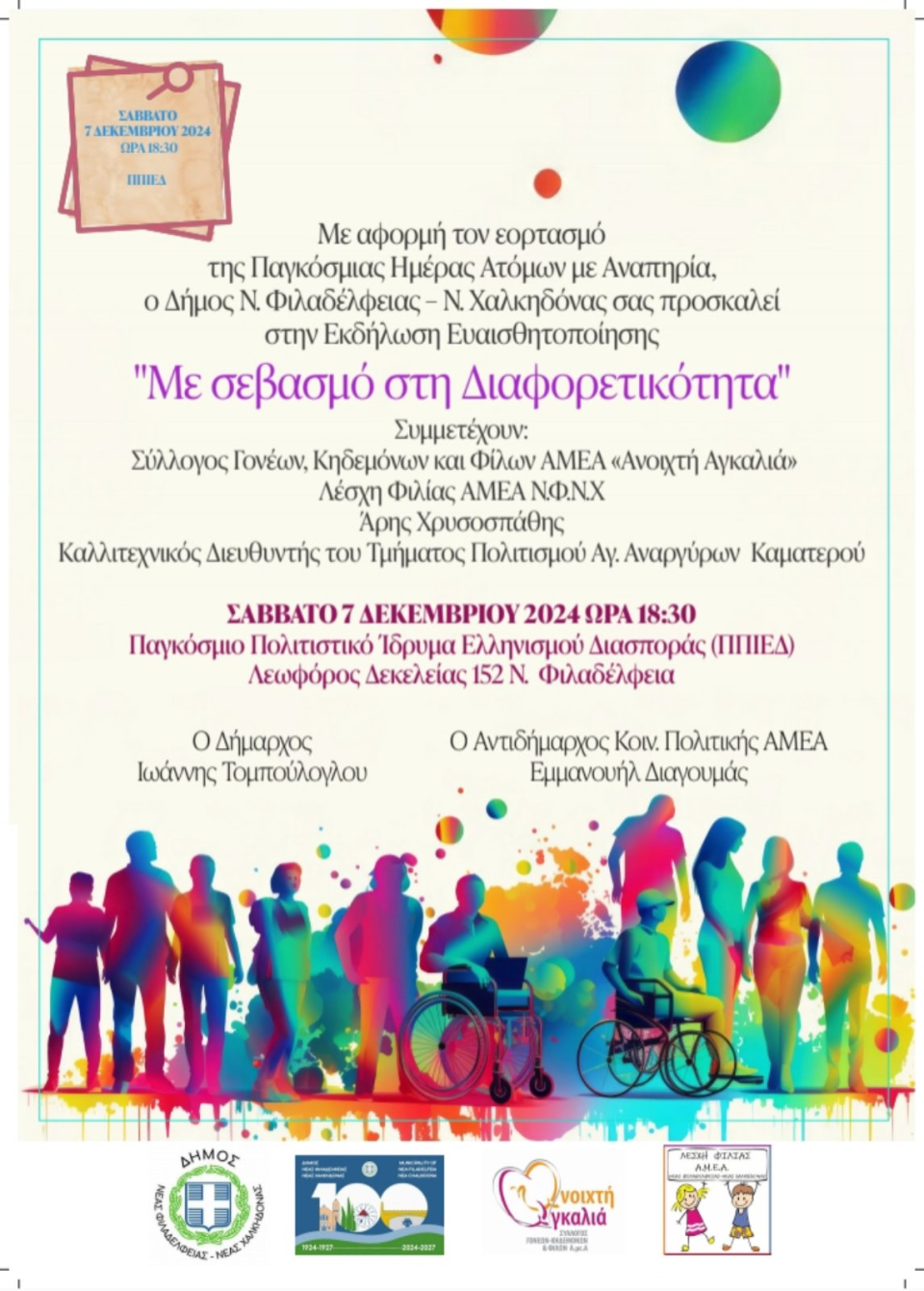 Με αφορμή τον εορτασμό της Παγκόσμιας Ημέρας Ατόμων με Αναπηρία, ο Δήμος Νέας Φιλαδέλφειας–Νέας Χαλκηδόνας σας προσκαλεί το Σάββατο 07/12/2024 στις 18:30 στην αίθουσα εκδηλώσεων του Π.Π.Ι.ΕΔ. (Λ. Δεκελείας 152), όπου θα πραγματοποιηθεί εκδήλωση με τίτλο «Με σεβασμό στην Διαφορετικότητα».
