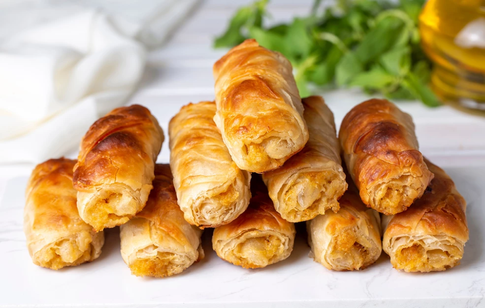 - Τοποθετήστε λίγη από τη γέμιση στο άκρο των φύλλων σφολιάτας, διπλώστε τις πλευρές και τυλίξτε σε ρολό.