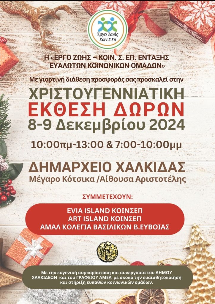 News ΑΜΕΑΚεντρικήΧριστουγεννιάτικη έκθεση by xristiana7 Δεκεμβρίου 20247 Δεκεμβρίου 20240234 Share00 7/12/2024…… Χριστουγεννιάτικες δημιουργίες από την Κοινσεπ ΕΡΓΟ ΖΩΗΣ θα φιλοξενηθούν στο δημαρχείο της Χαλκίδας 8 και 9 Δεκεμβρίου, μπορείτε να προμηθευτείτε χειροποίητα και ιδιαίτερα δώρα για όσους αγαπάτε και να τους προσφέρετε ένα όμορφο δώρο για τις γιορτέ.