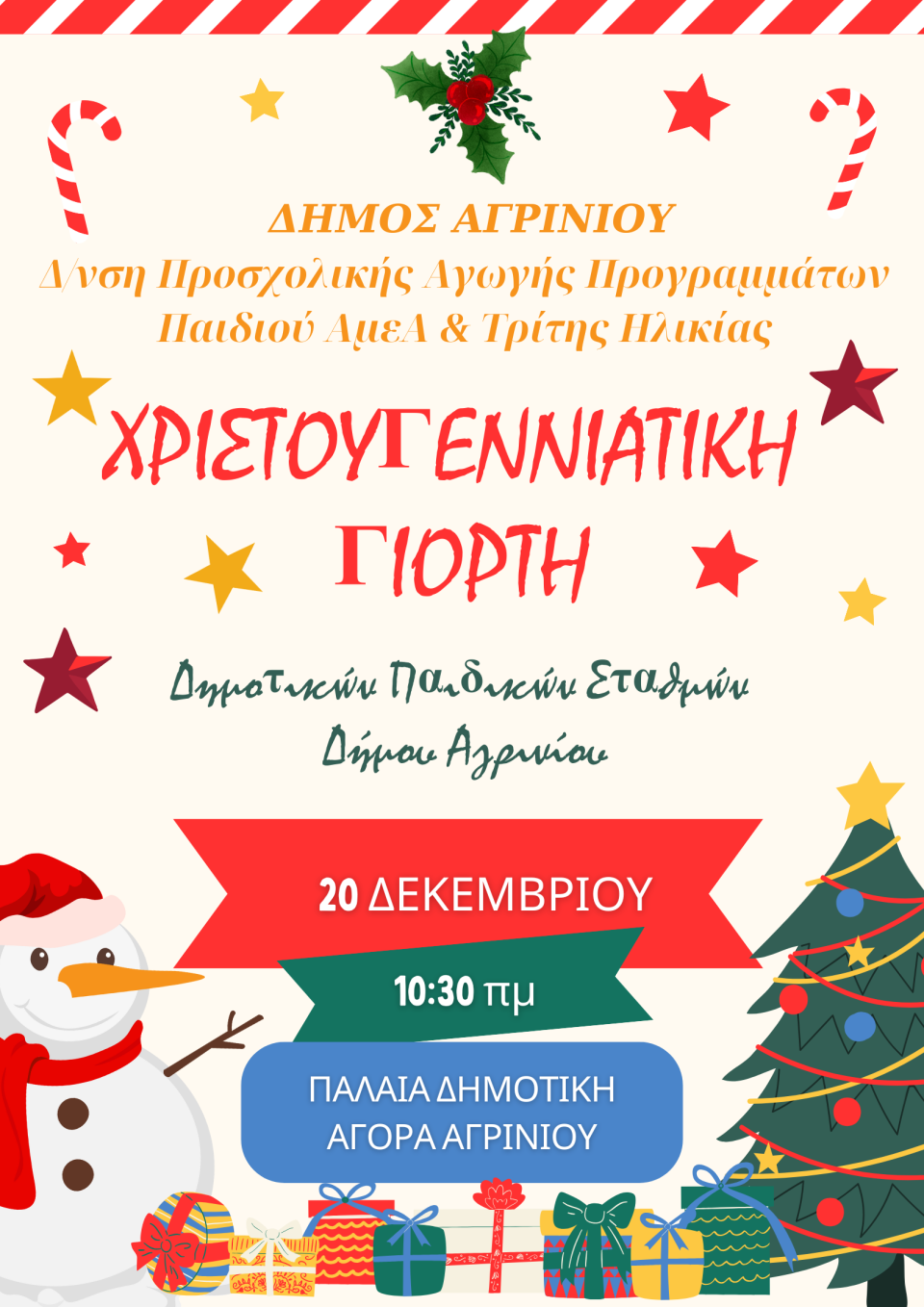Την Παρασκευή 20 Δεκεμβρίου στις 10:30 π.μ., στην Παλαιά Δημοτική Αγορά, η Διεύθυνση Προσχολικής Αγωγής Προγραμμάτων Παιδιού, ΑμεΑ και Τρίτης ηλικίας πραγματοποιεί τη Χριστουγεννιάτικη γιορτή των Παιδικών Σταθμών του Δήμου Αγρινίου.