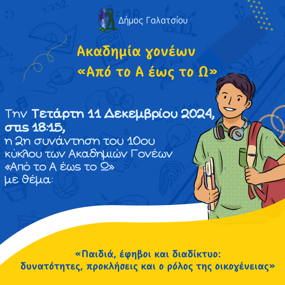 Το Κέντρο Πρόληψης Υγείας (ΚΕΠ Υγείας) του Δήμου Γαλατσίου  και το Ελληνικό Διαδημοτικό Δίκτυο Υγιών Πόλεων (ΕΔΔΥΠΠΥ) του Π.Ο.Υ. διοργανώνουν τον φετινό κύκλο των Ακαδημιών Γονέων “Από το Α έως το Ω”,  που πραγματοποιείται για 10η συνεχή χρονιά από το ΠΜΣ “Στρατηγικές Αναπτυξιακής και Εφηβικής Υγείας” της Ιατρικής Σχολής του Εθνικού και Καποδιστριακού Πανεπιστημίου Αθηνών και την Ελληνική Εταιρεία Εφηβικής Ιατρικής (Ε.Ε.Ε.Ι.). Κάθε χρόνο, παρουσιάζονται θέματα σχετικά με την υγεία, την ανάπτυξη και τη συμπεριφορά των παιδιών, τις σχέσεις στην οικογένεια και το σχολείο κ.λπ. και τελεί υπό την Αιγίδα του ΕΔΔΥΠΠΥ.