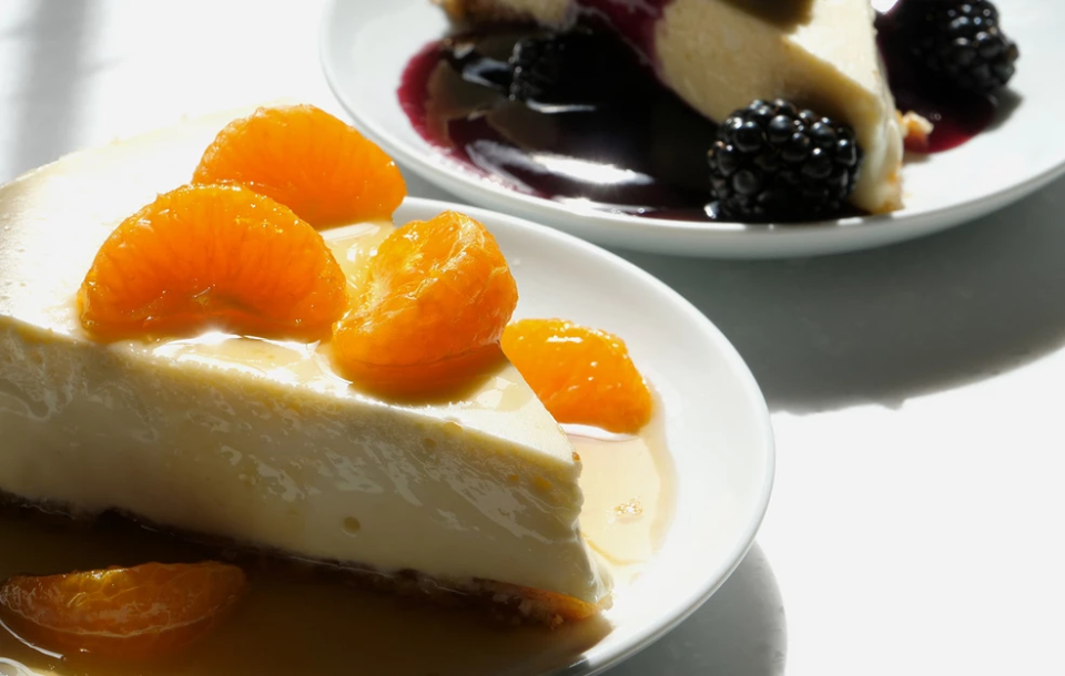 - Βγάλτε τη φόρμα από το ψυγείο. Ρίξτε τη γέμιση πάνω από τη βάση μπισκότων και απλώστε την ομοιόμορφα. Διακοσμήστε με κομμάτια πορτοκαλιού και επαναφέρετε στο ψυγείο μέχρι να σερβίρετε (τουλάχιστον 4 ώρες ή όλη τη νύχτα).
