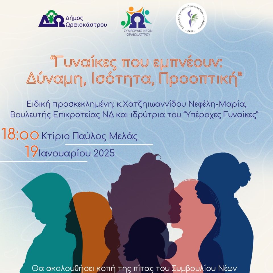 Το Συμβούλιο Νέων του Δήμου Ωραιοκάστρου με ιδιαίτερη χαρά σας προσκαλεί στην εκδήλωση με τίτλο: «Γυναίκες που Εμπνέουν: Δύναμη, Ισότητα, Προοπτική», αφιερωμένη στη γυναικεία ενδυνάμωση.