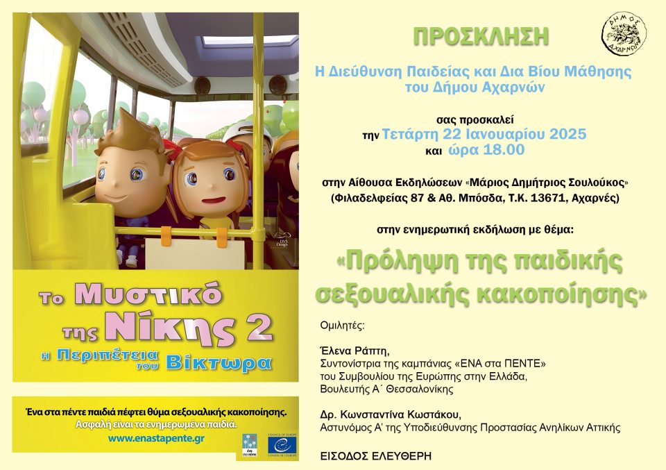 Ενημερωτική εκδήλωση με θέμα: «Πρόληψη της παιδικής σεξουαλικής κακοποίησης» διοργανώνει την Τετάρτη 22 Ιανουαρίου, στις 6 το απόγευμα, η Διεύθυνση Παιδείας και Νέας Γενιάς του Δήμου Αχαρνών στην Αίθουσα Εκδηλώσεων «Μάριος Δημήτριος Σουλούκος».