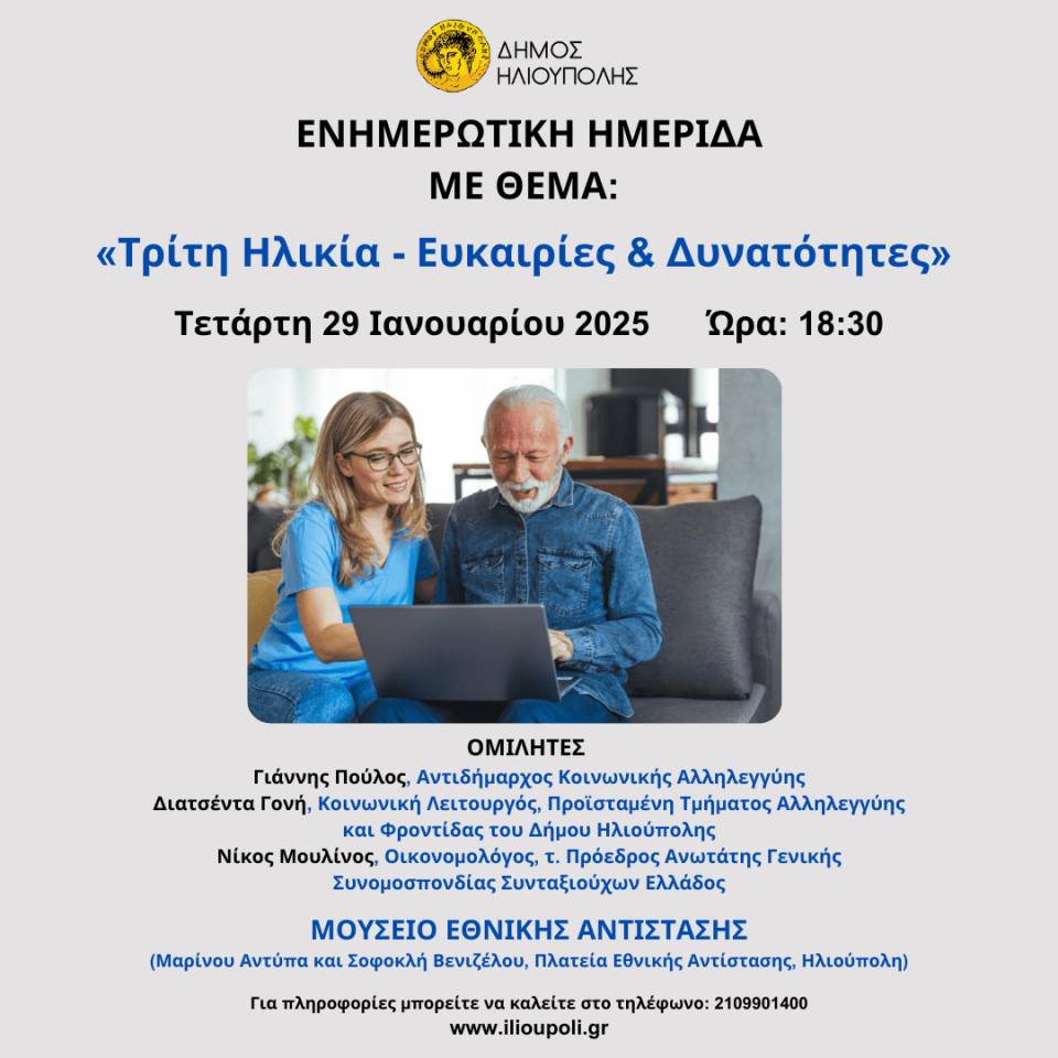 Ο Δήμος Ηλιούπολης έχει την τιμή να σας προσκαλέσει την Τετάρτη 29 Ιανουαρίου 2025 και ώρα 18:30 μ.μ. σε μία ξεχωριστή Ημερίδα με θέμα «Τρίτη Ηλικία – Ευκαιρίες & Δυνατότητες» με σκοπό την ευαισθητοποίηση σε ζητήματα που αφορούν στην Τρίτη Ηλικία.