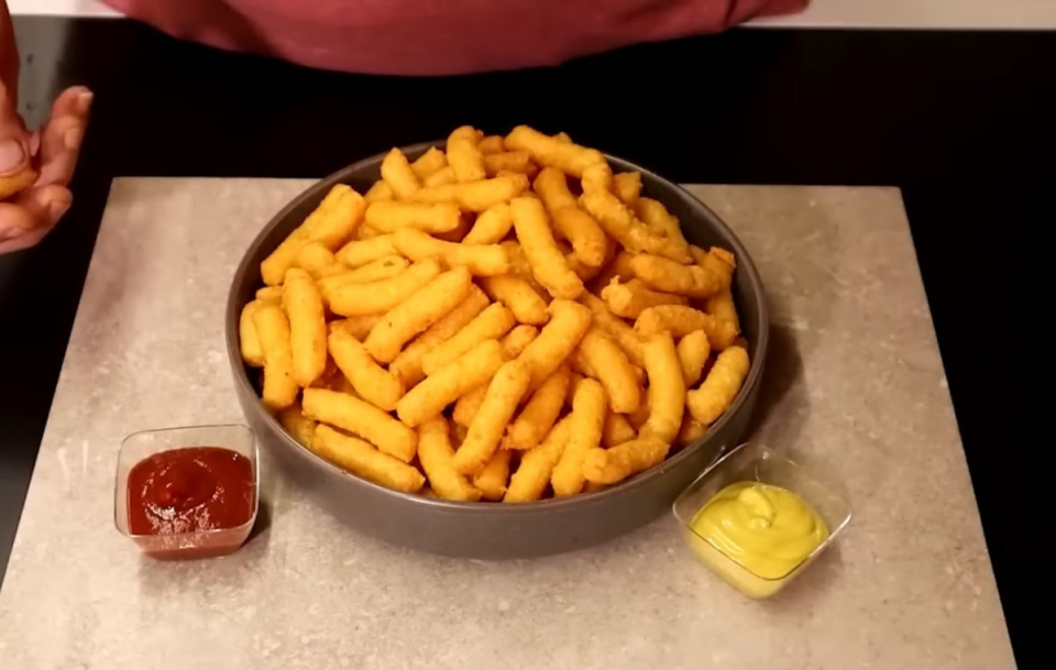 Βάζουμε ένα τηγάνι με ηλιέλαιο στη φωτιά. Αφού ζεσταθεί καλά το λάδι προσθέτουμε μικρές δόσεις της ζύμης να τηγανιστούν με τη βοήθεια του κορνέ και ενός ψαλιδιού κόβουμε ώστε να μοιάζουν με γαριδάκια.