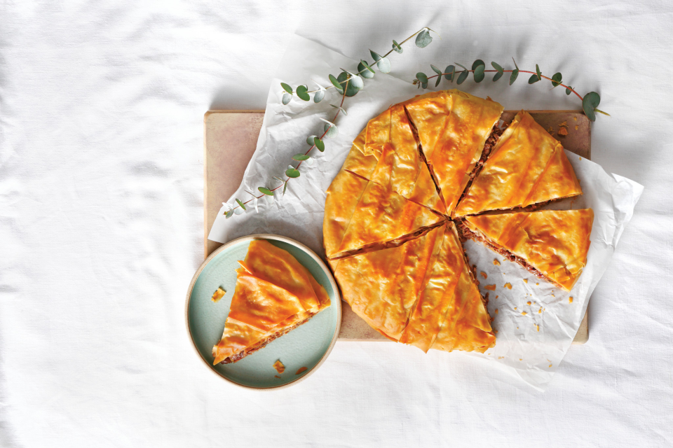 Λαδώνουμε ένα ρηχό ταψί 36 εκ. και στρώνουμε ακτινωτά τα μισά φύλλα, ραντίζοντάς τα με ελαιόλαδο. Απλώνουμε τη γέμιση, γυρίζοντας πάνω της τις άκρες των φύλλων που περισσεύουν.